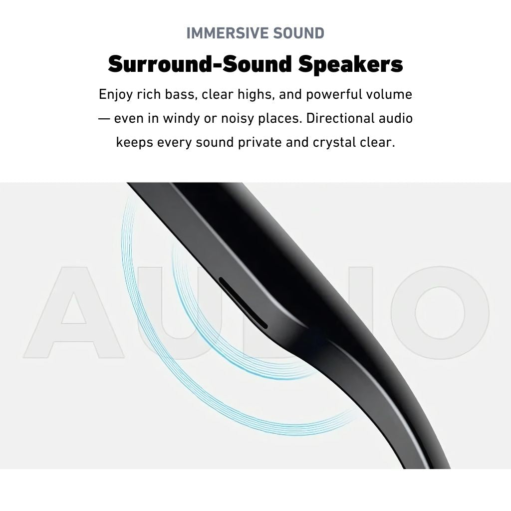 Captura videos y fotos en HD, controla todo sin usar las manos con comandos de voz por IA, disfruta de un sonido envolvente y mantente conectado sin esfuerzo, todo en un elegante par de gafas inteligentes.